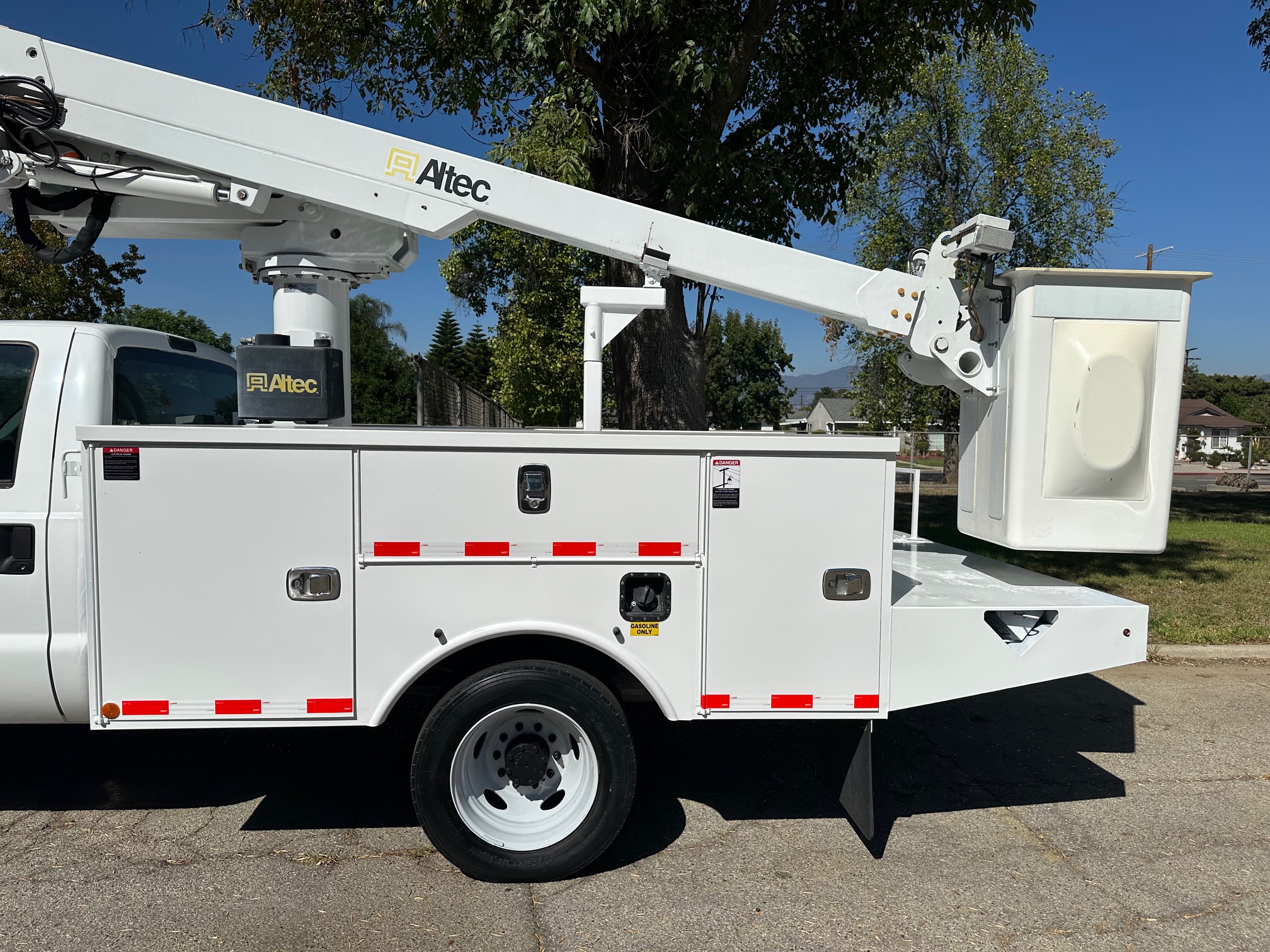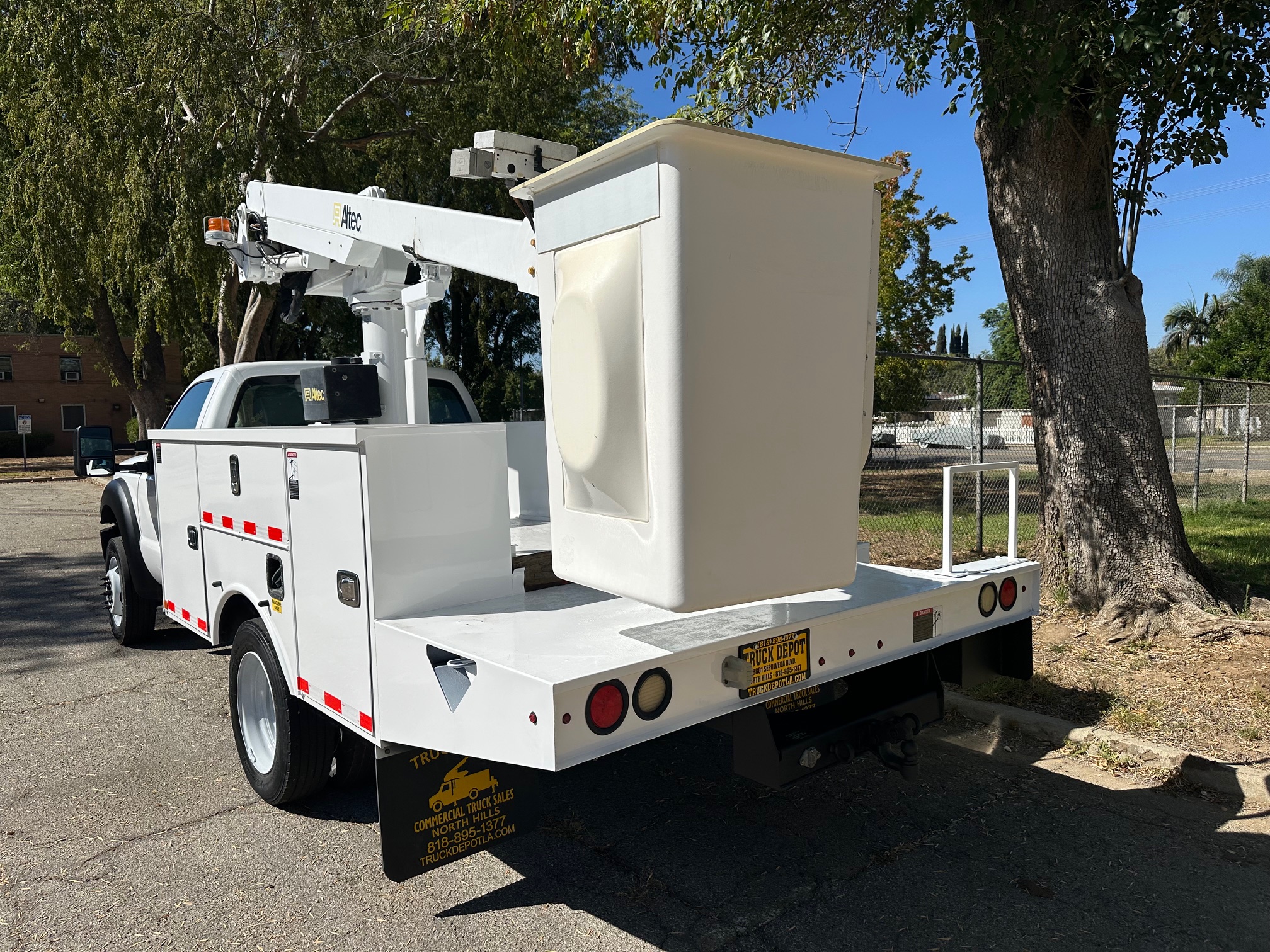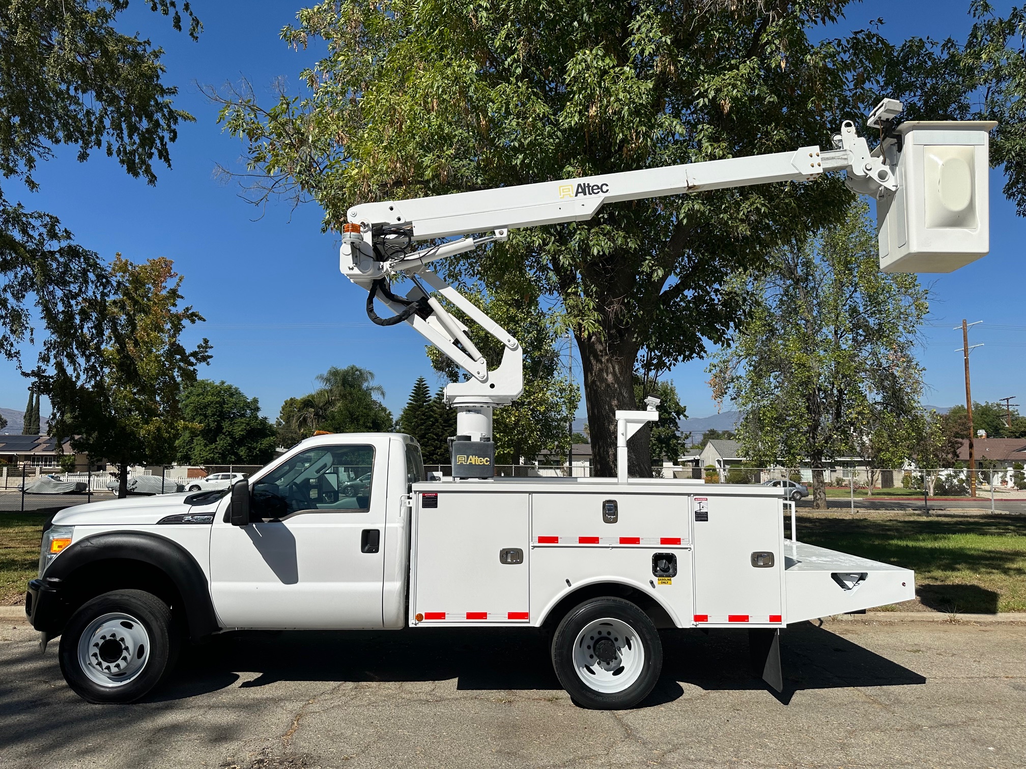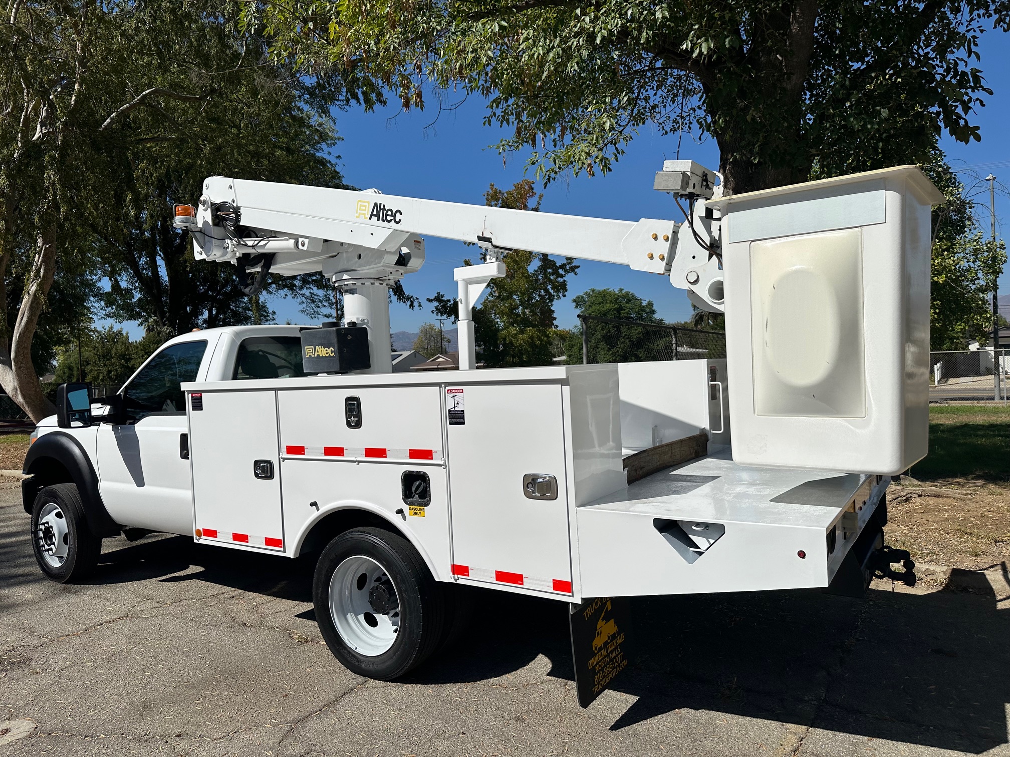 2015 Ford F-450 Bucket Truck, 6.8L V-10, auto trans, A/C, tilt, cruise, 138k miles, P.T.O. driven boom, strobe lights, Altec AT235 boom, 35' platform height, 42' working height, 350 lbs. capacity, Magnum Energy power inverter, 12' Altec steel service body, slide lock security bar, tow pkg, new tires, just serviced, runs & operates great. Nationwide shipping and financing are available. Checkout all our inventory at TruckDepotLA.com