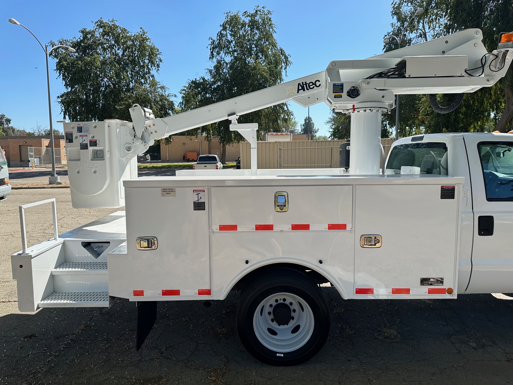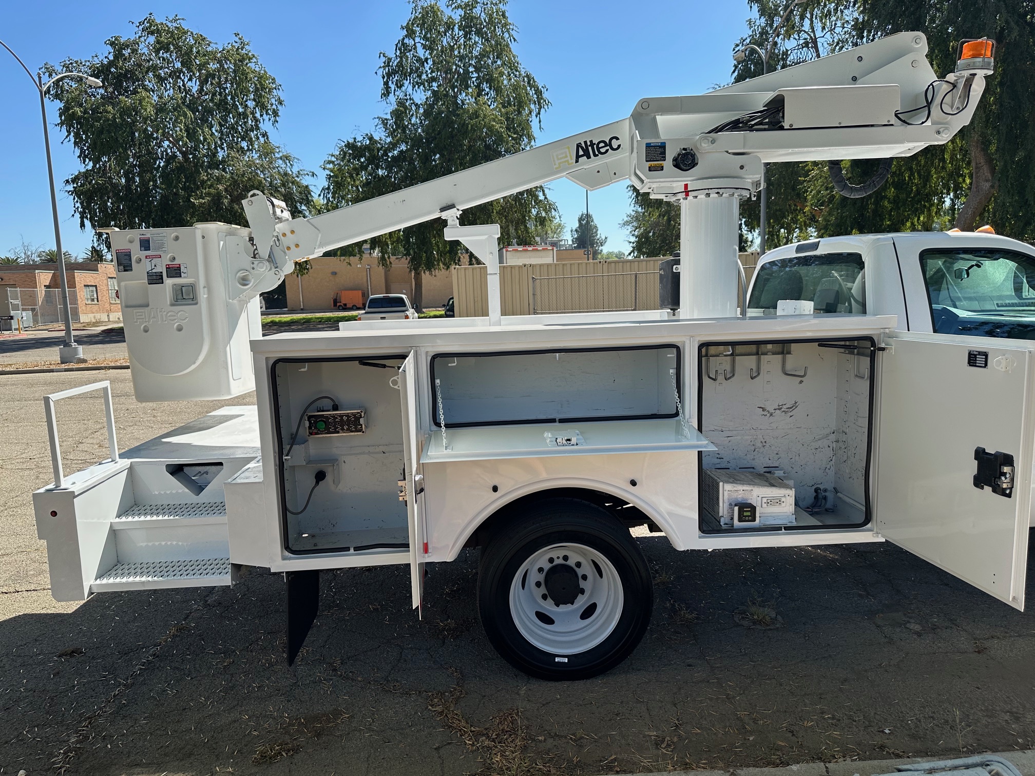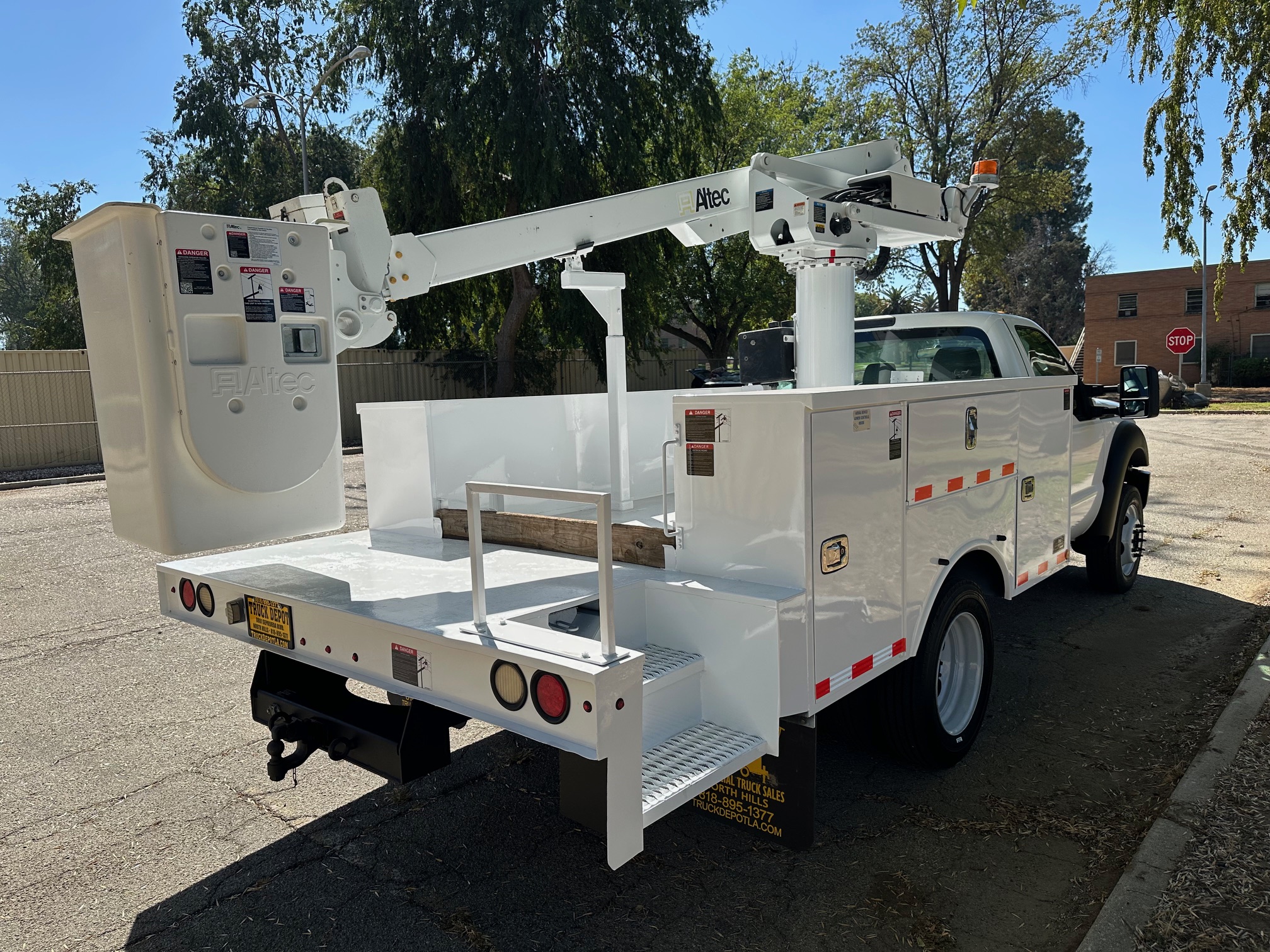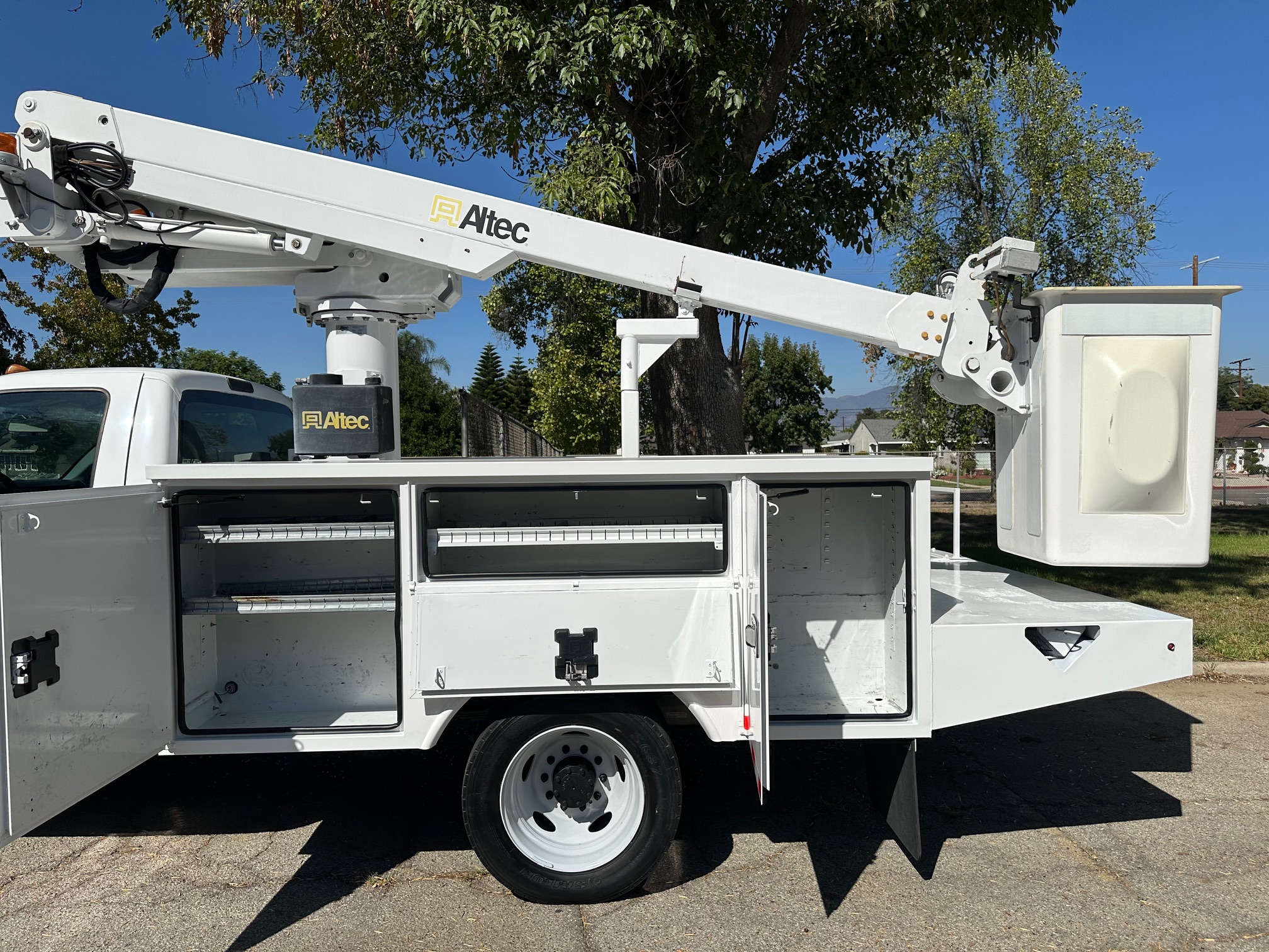 2015 Ford F-450 Bucket Truck, 6.8L V-10, auto trans, A/C, tilt, cruise, 138k miles, P.T.O. driven boom, strobe lights, Altec AT235 boom, 35' platform height, 42' working height, 350 lbs. capacity, Magnum Energy power inverter, 12' Altec steel service body, slide lock security bar, tow pkg, new tires, just serviced, runs & operates great. Nationwide shipping and financing are available. Checkout all our inventory at TruckDepotLA.com