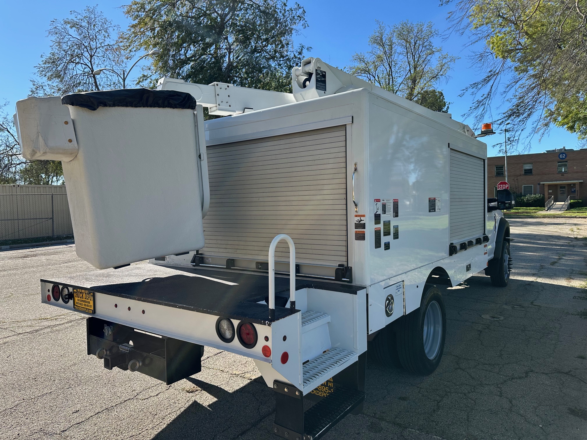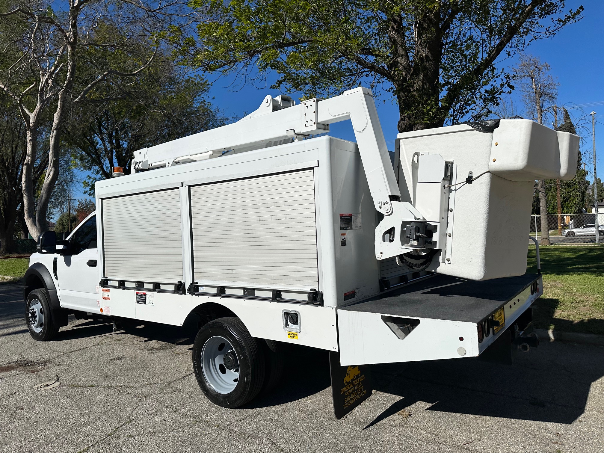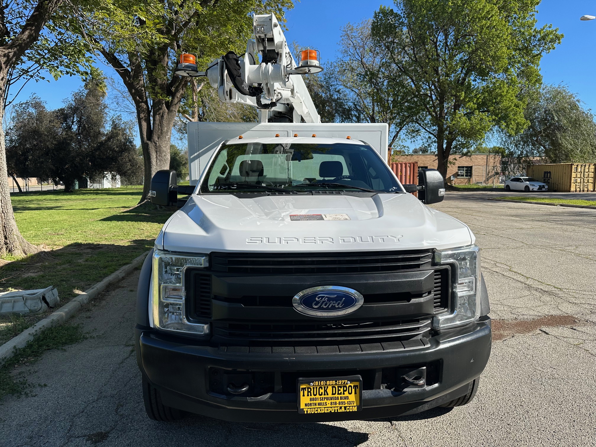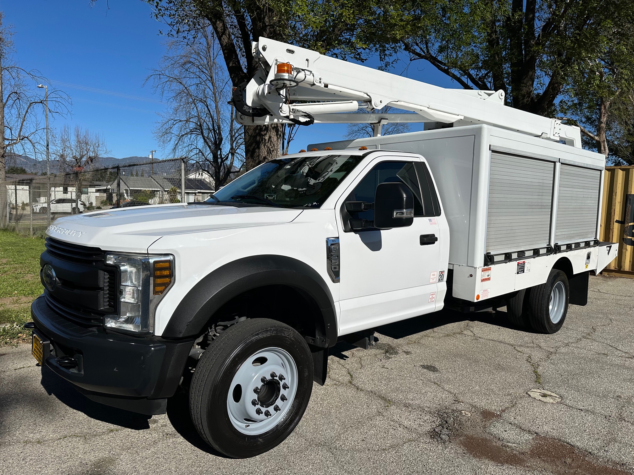 2019 Ford F-550 Bucket Truck/ Boom Truck 6.8L V-10, auto trans, A/C, tilt, cruise, steering wheel controls, 163k miles, power windows and lock, power mirrors, alarm, 19,500 g.v.w., strobe lights, backup alarm, Altec aluminum 11' body, large capacity ladder tunnel and long bulb storage, Altec boom, model#AT248F, 43'6" platform height, 48'6" working height, serial#1219FL0576, 350 lbs. capacity, pistol grip upper controller, self leveling platform, lower assist controls, insulated boom and basket, side to side basket rotation, 110v outlet at boom tip, power inverter, 80% rear tire tread, new front tires, tow pkg, clean original paint, no rust, fleet serviced and maintained since new. Nationwide shipping and financing are available. Checkout all our inventory at TruckDepotLA.com.