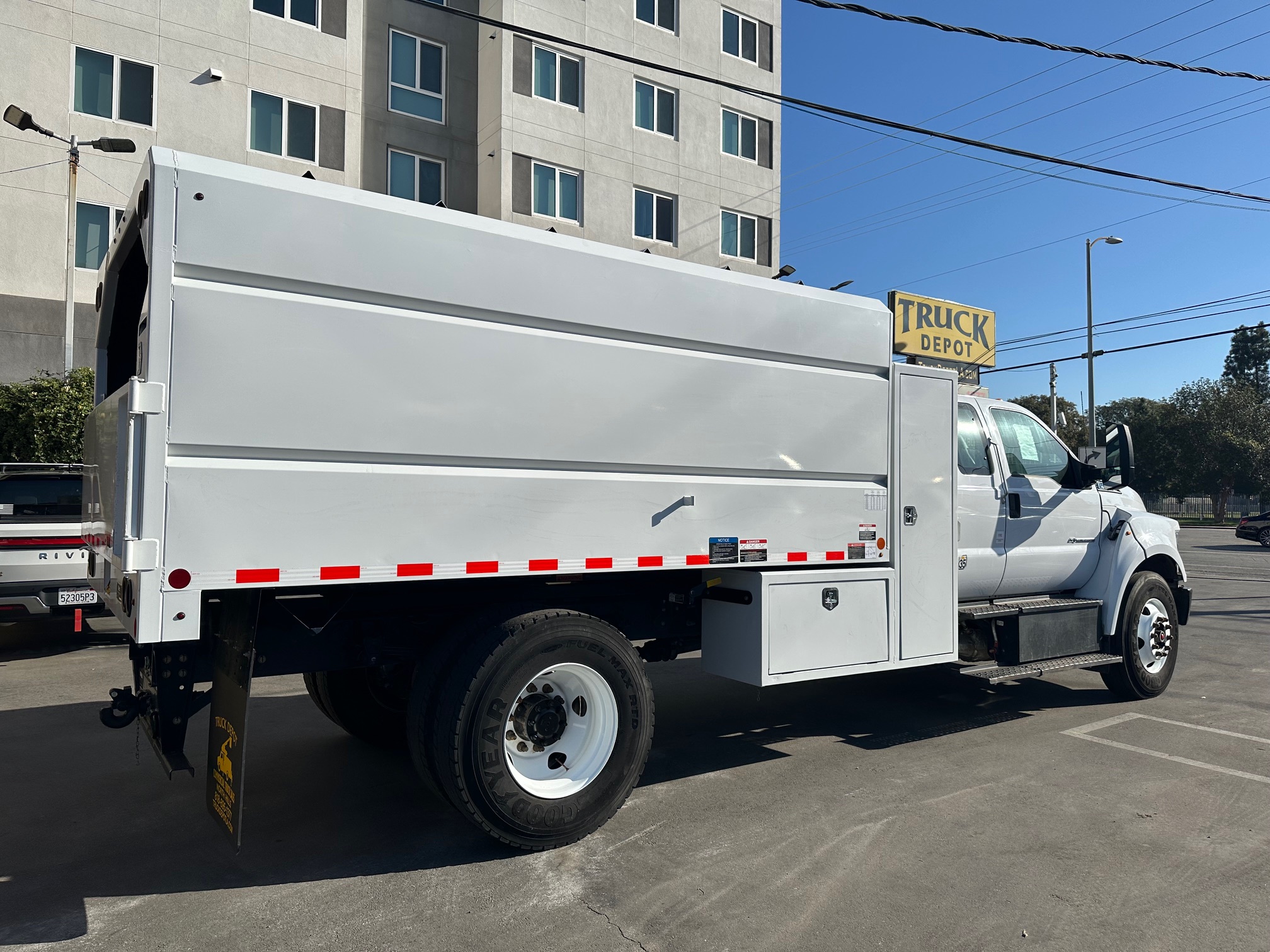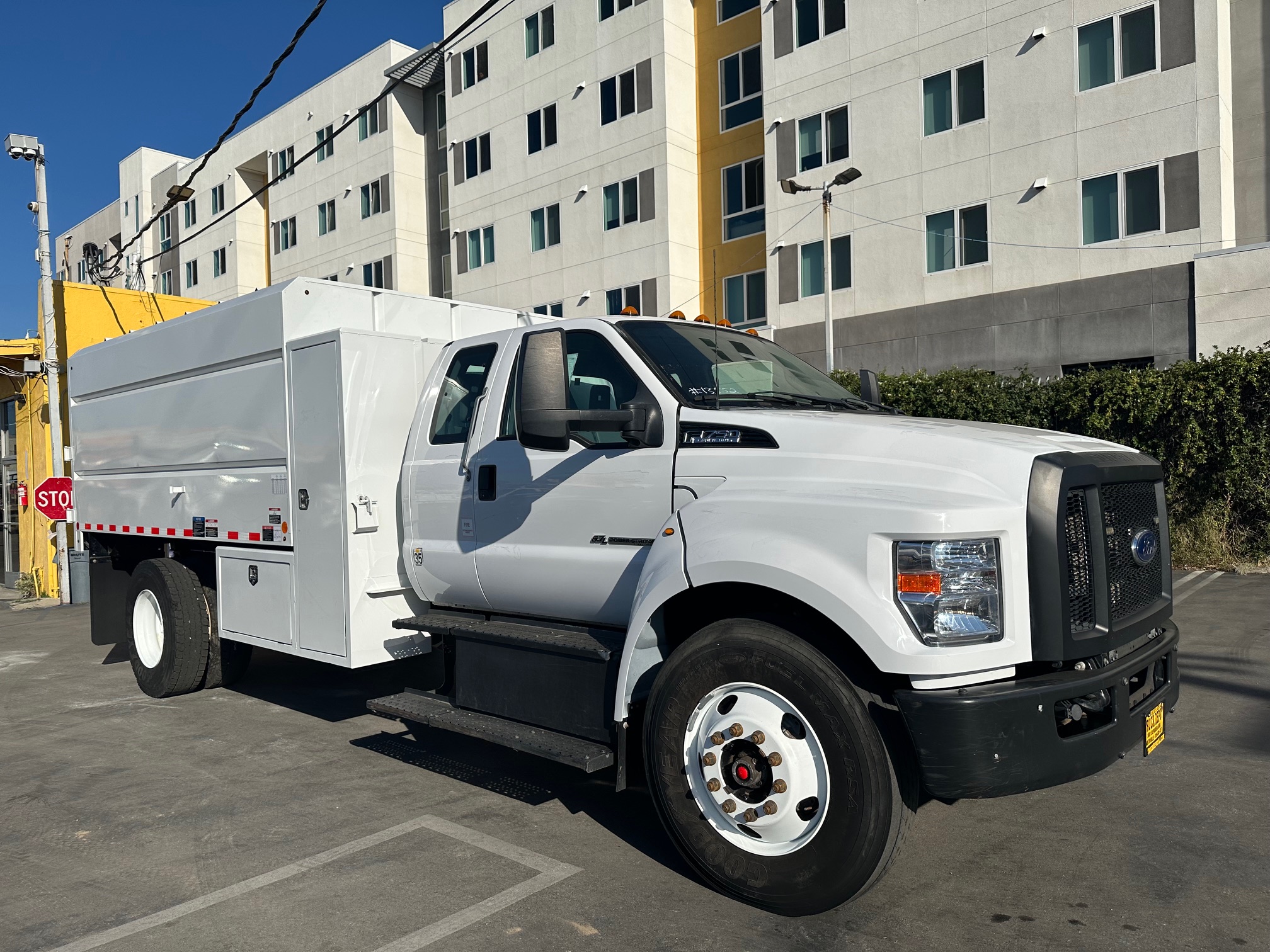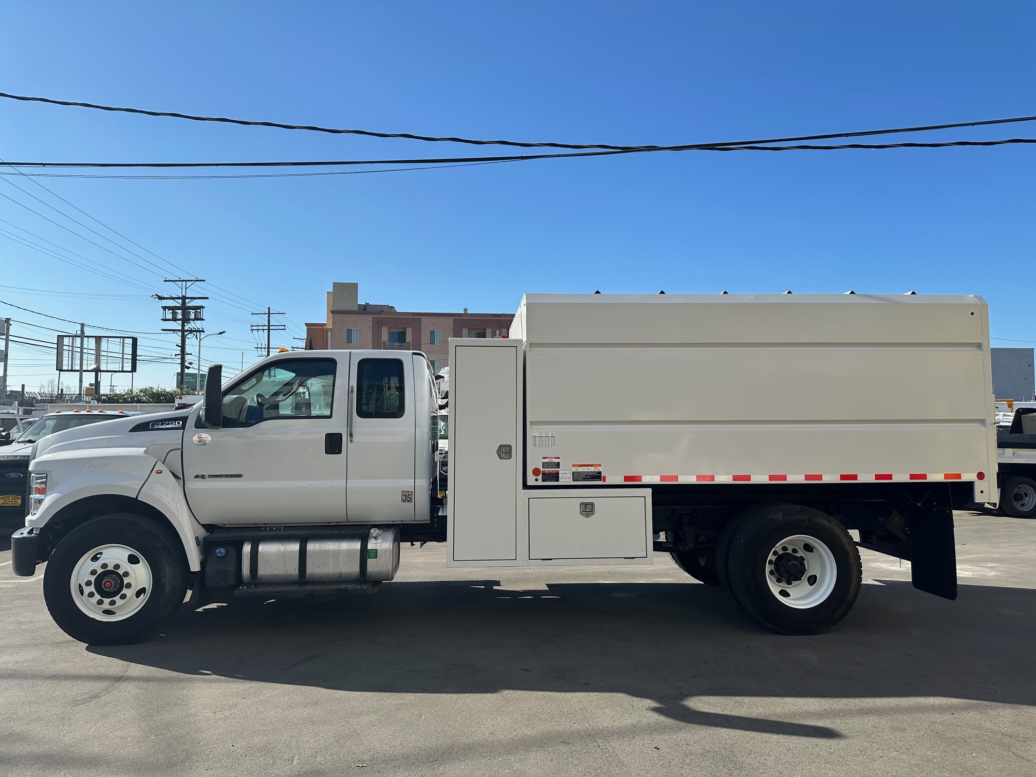 2022 Ford F-750 Extra Cab Chipper Dump Truck powered by a 6.7L Power Stroke diesel engine paired with an Allison automatic transmission. Equipped with A/C, Bluetooth radio, and steering wheel controls for added comfort and convenience. This truck has only 40,000 miles and features hydraulic brakes, trailer brakes, and strobe lights.