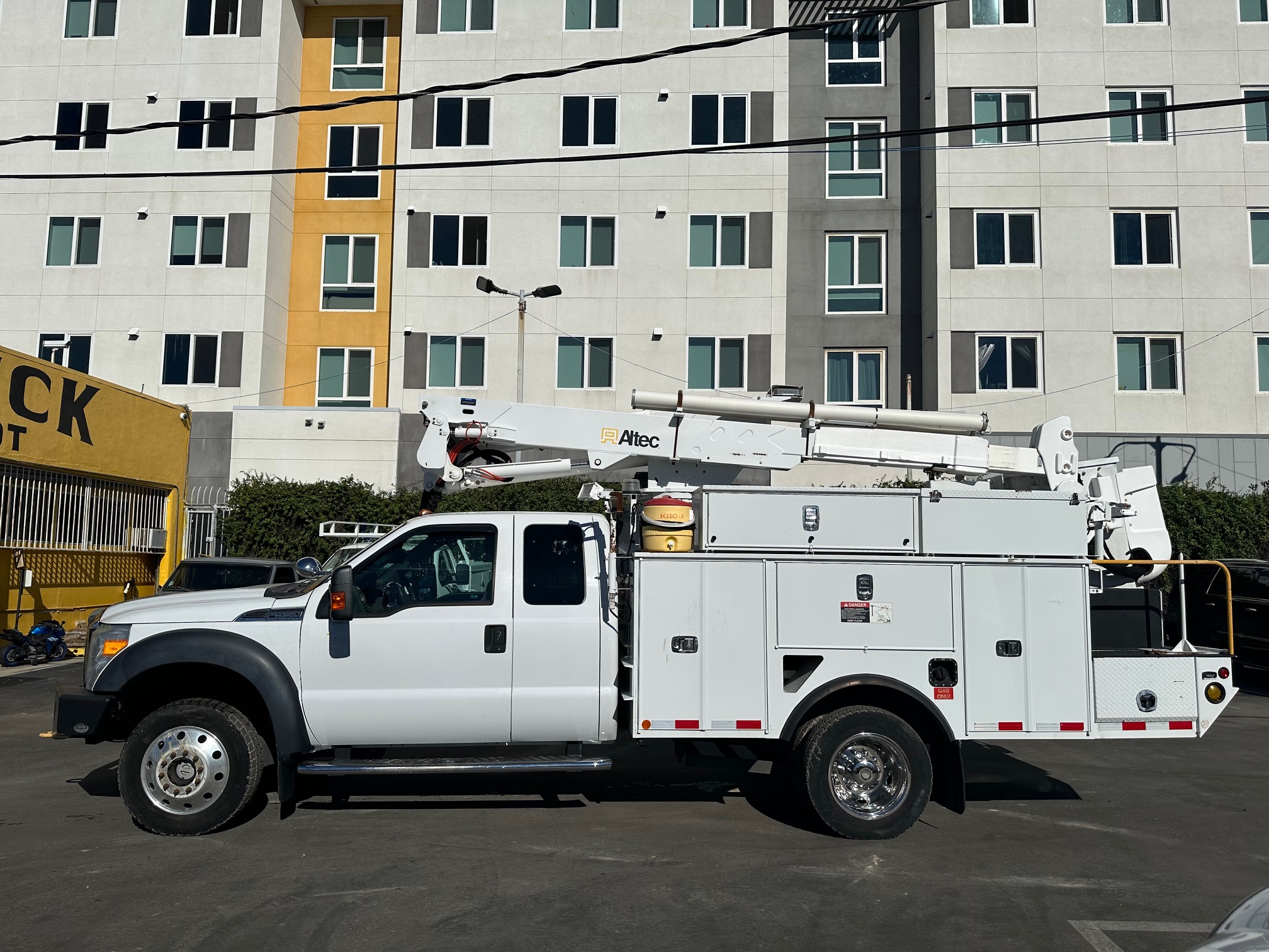 2015 Ford F-550 Extra Cab 4x4 Bucket Truck, 6.8L V-10, auto trans, A/C, 140K miles, tilt, cruise, steering wheel controls, power windows & locks, power mirrors, backup camera, trailer brakes, traffic director, strobe lights, flood lights, 913 p.t.o. hours, Altec service body, slide lock security bar, Altec boom, model# AT37-G, serial#0814DE16965, 350 LBS. capacity, 37.9 ft platform height, 43' working height, insulated boom & bucket, side to side basket rotation, pistol grip upper controller, hydraulic tool circuit, basket door, tow pkg, new rear tires, 70% front tire tread, just serviced, fleet maintained since new. Nationwide shipping and financing are available. Checkout all our inventory at TruckDepotLA.com.