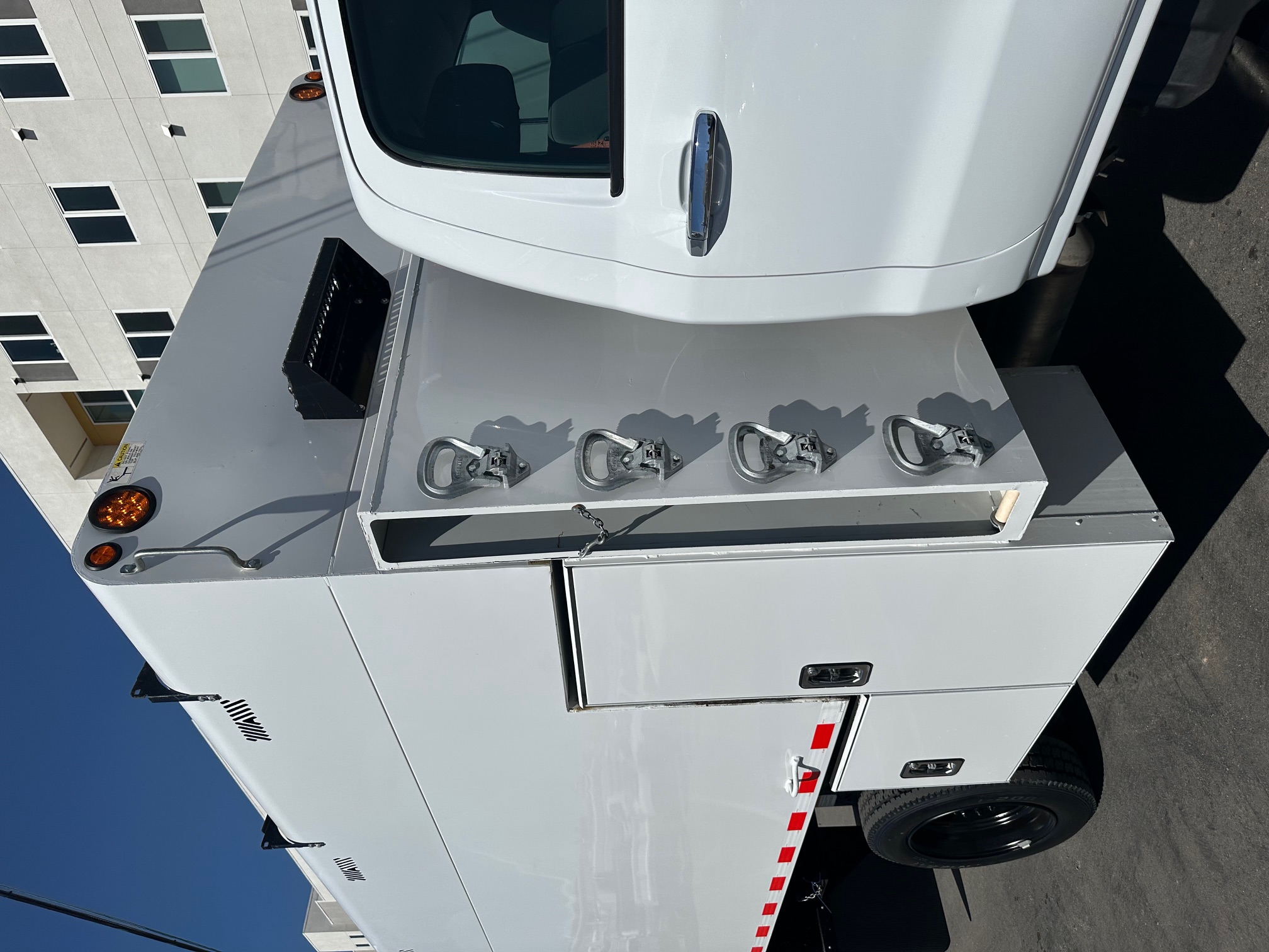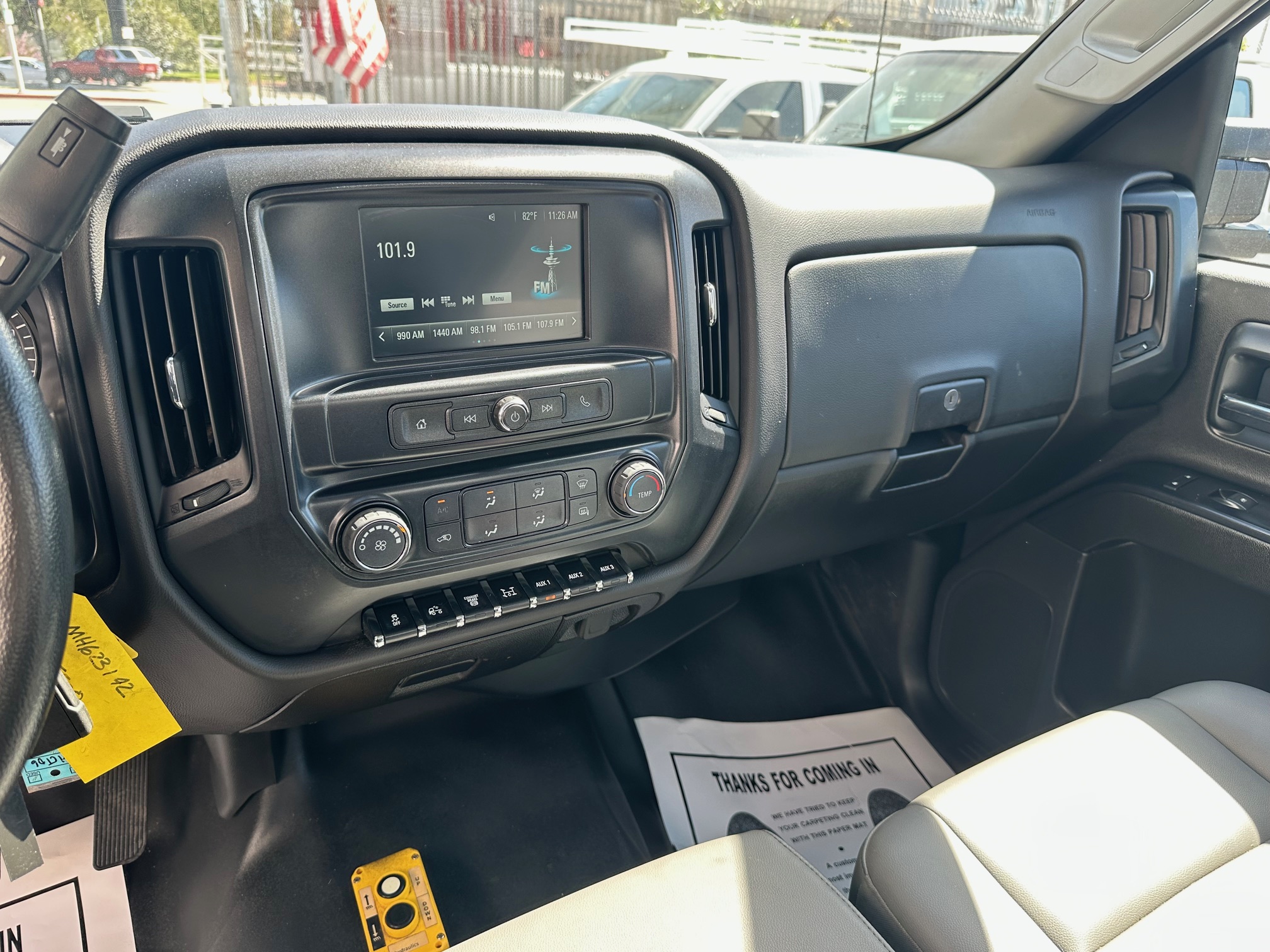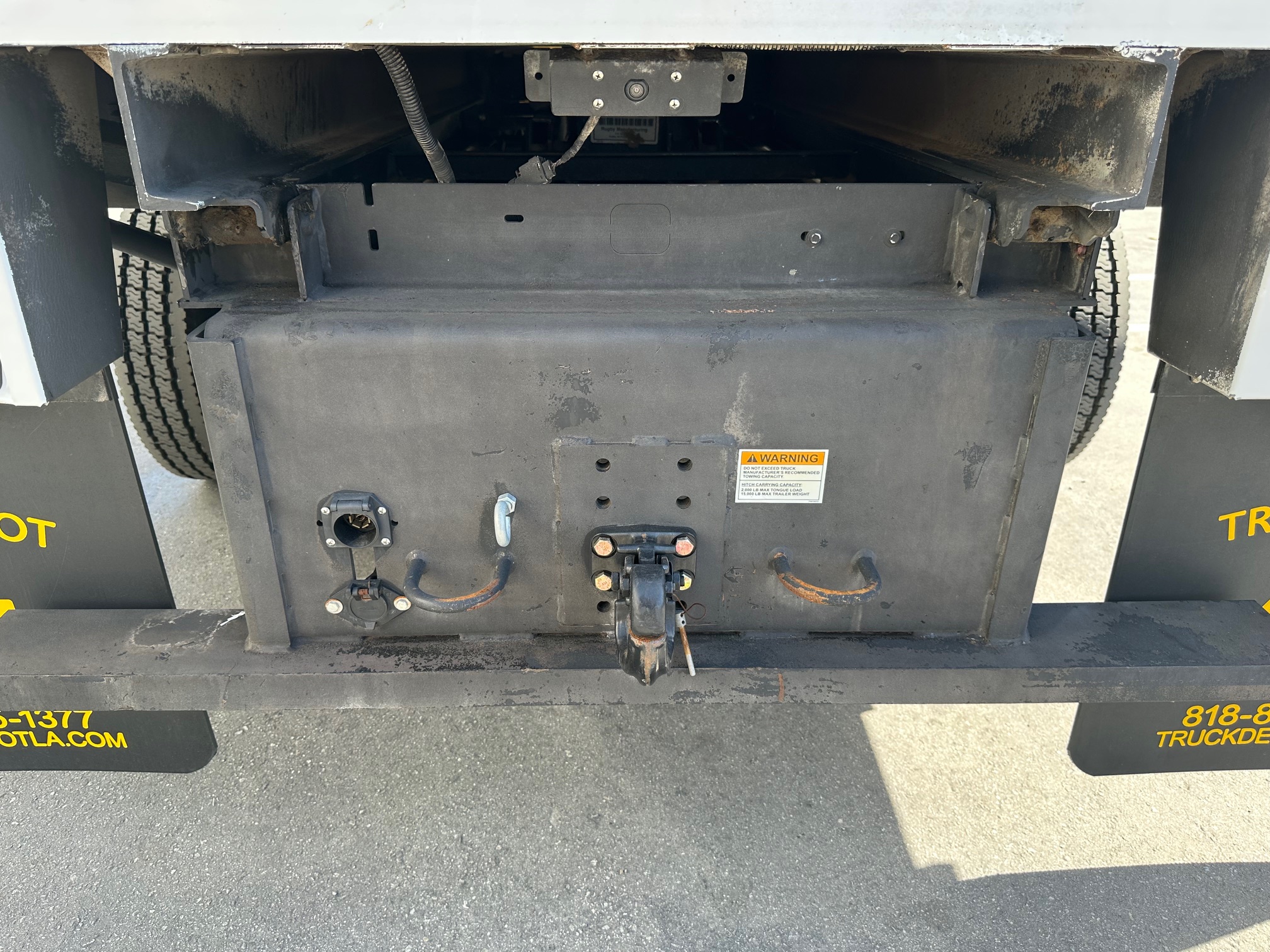 Inside the cab, the truck is well equipped for comfort and convenience with cold air conditioning, tilt steering, cruise control, power windows and door locks, power mirrors, a factory alarm system, and a backup camera for safer maneuvering in tight work areas. An exhaust brake provides additional control and braking power when hauling heavy loads or traveling downhill, while trailer brakes and a pintle hitch allow for easy towing of equipment or trailers.