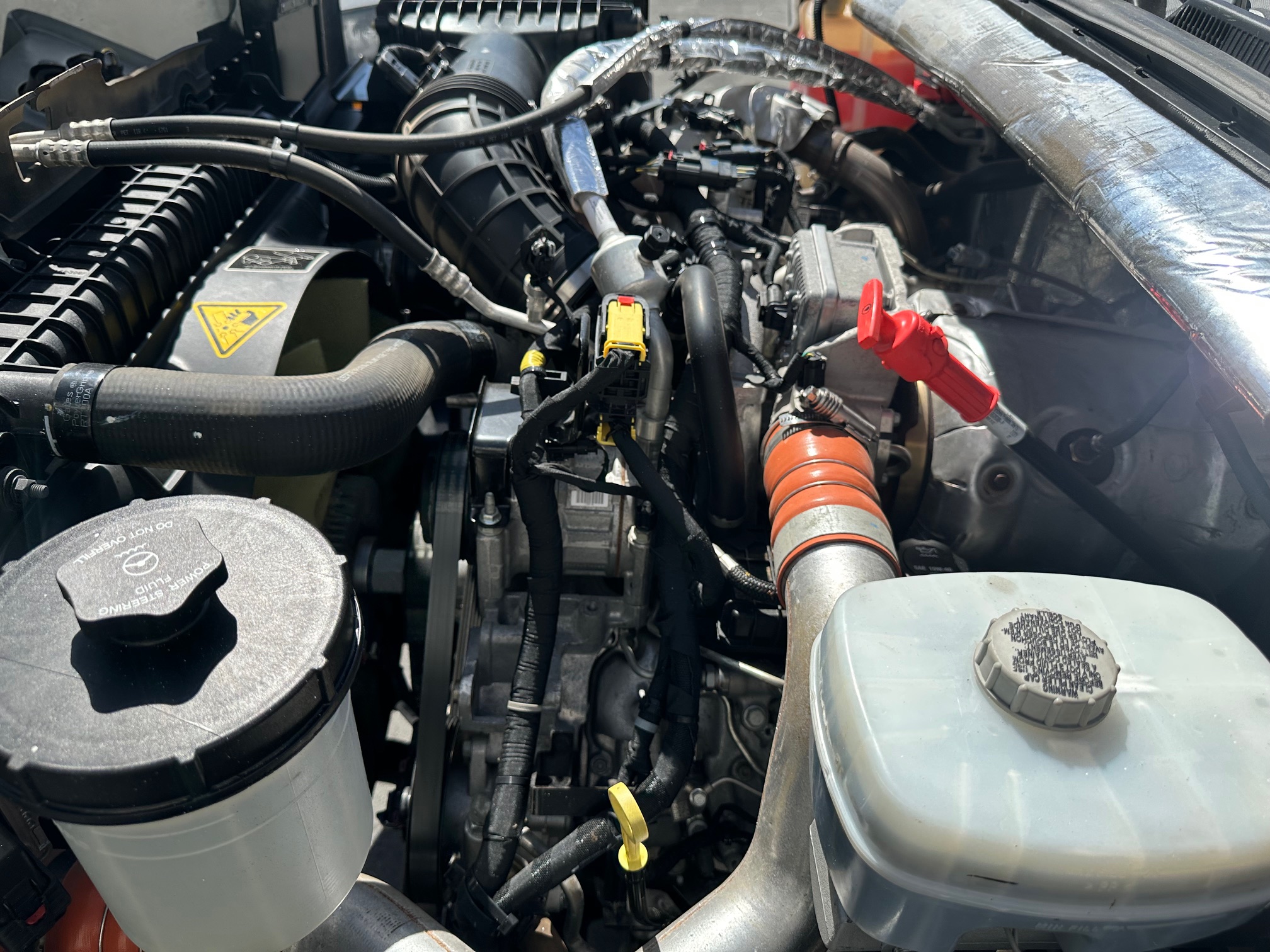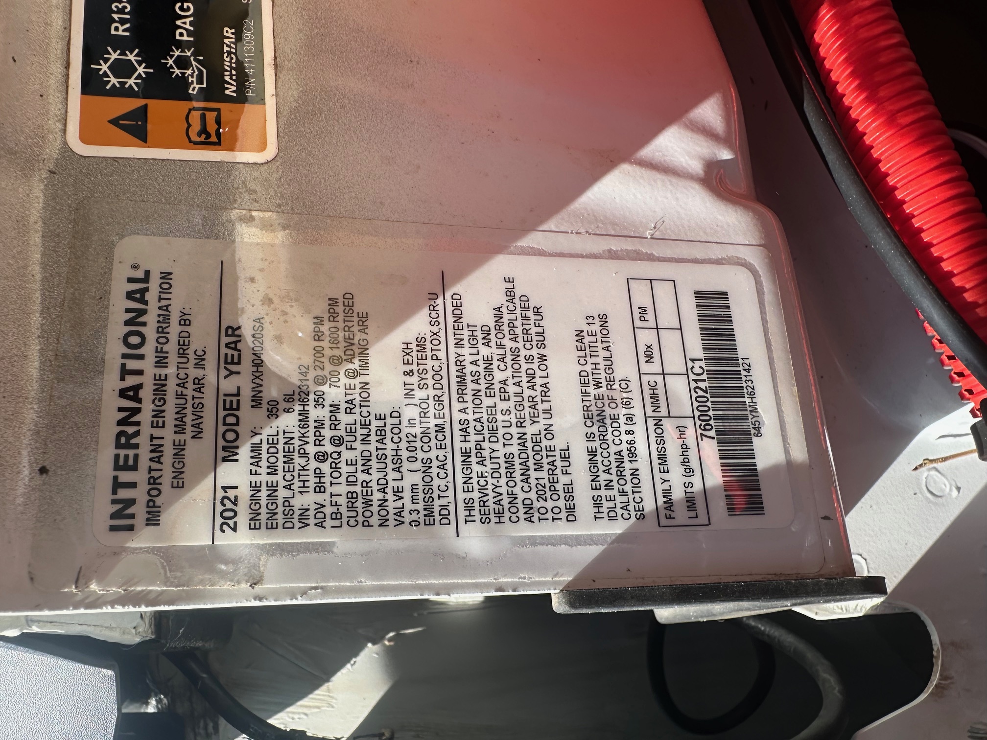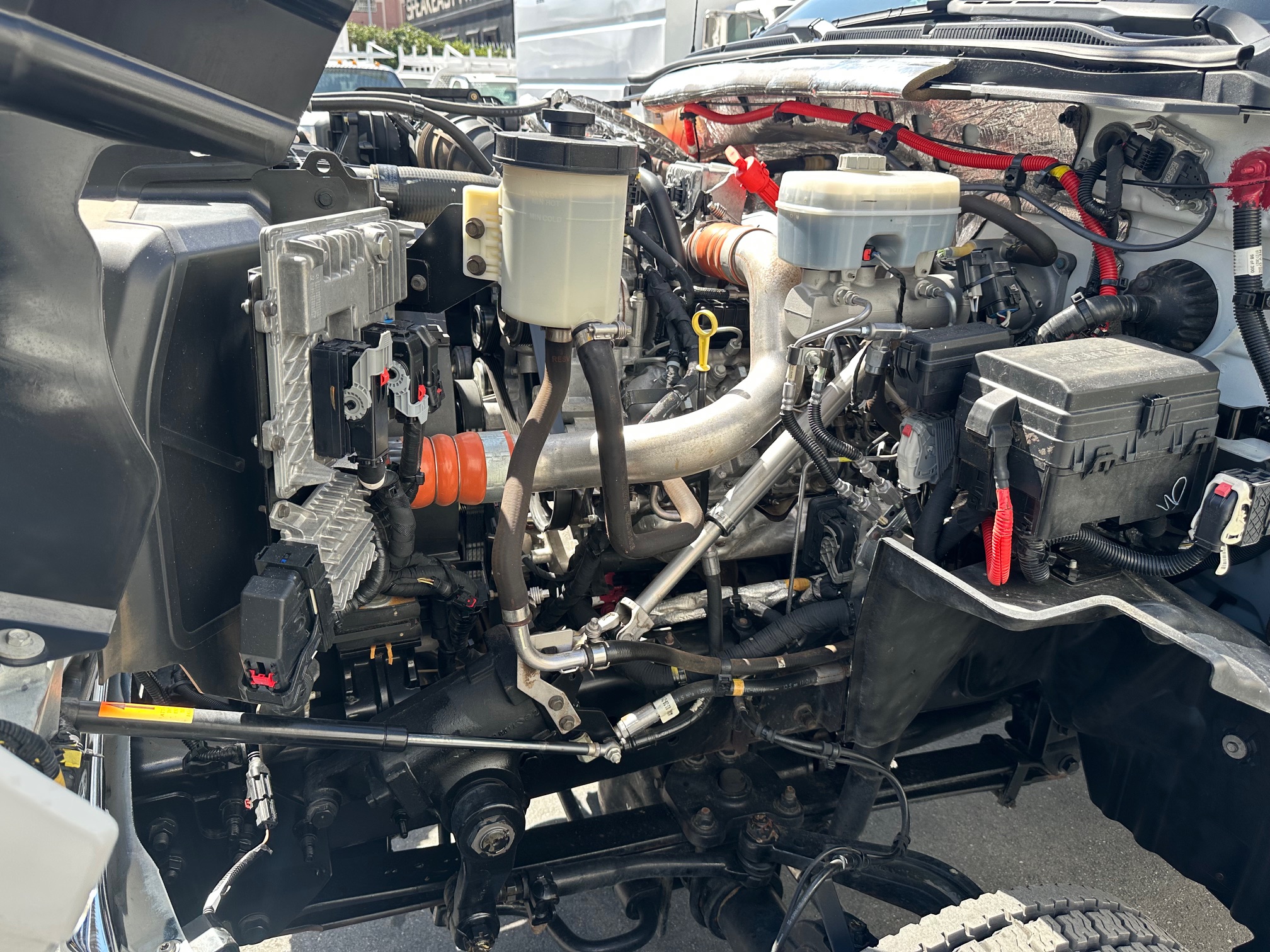 Inside the cab, the truck is well equipped for comfort and convenience with cold air conditioning, tilt steering, cruise control, power windows and door locks, power mirrors, a factory alarm system, and a backup camera for safer maneuvering in tight work areas. An exhaust brake provides additional control and braking power when hauling heavy loads or traveling downhill, while trailer brakes and a pintle hitch allow for easy towing of equipment or trailers.