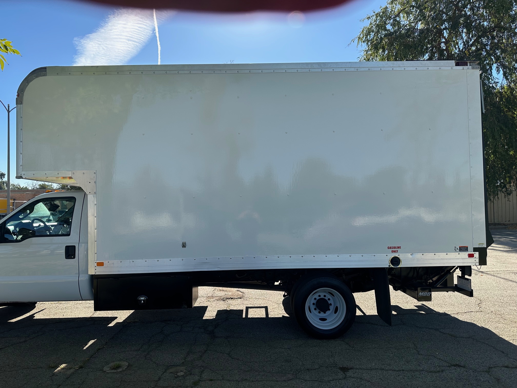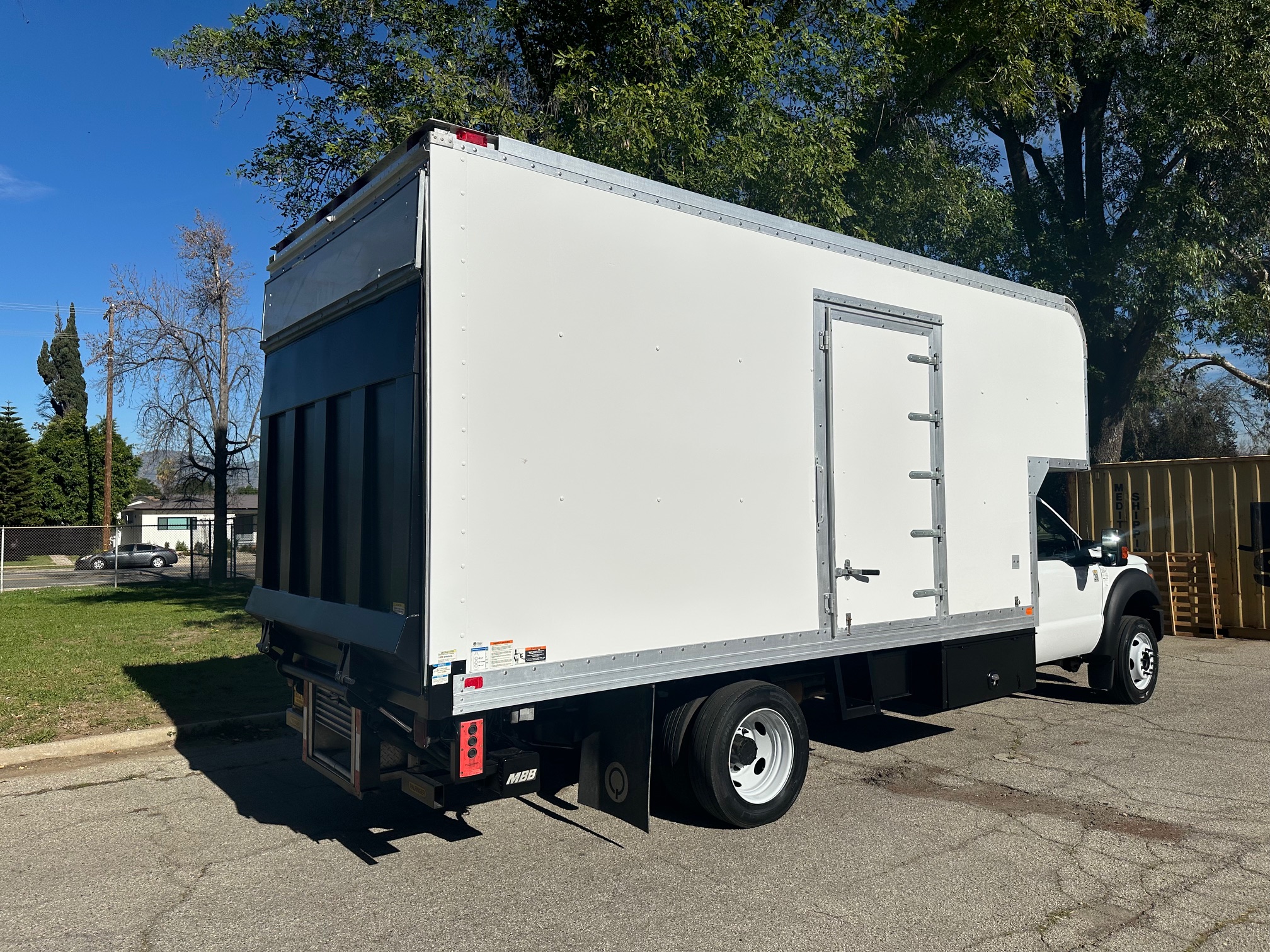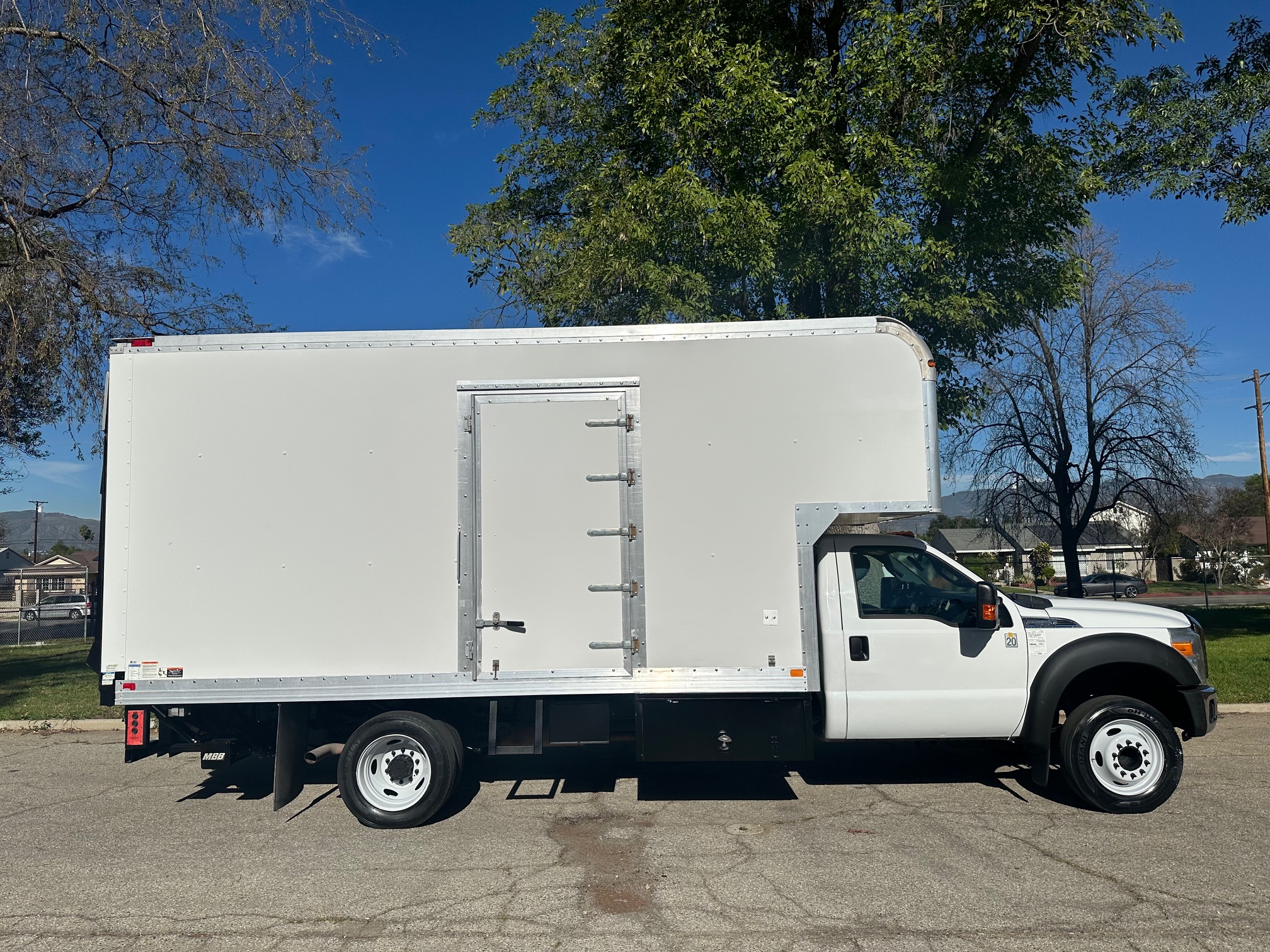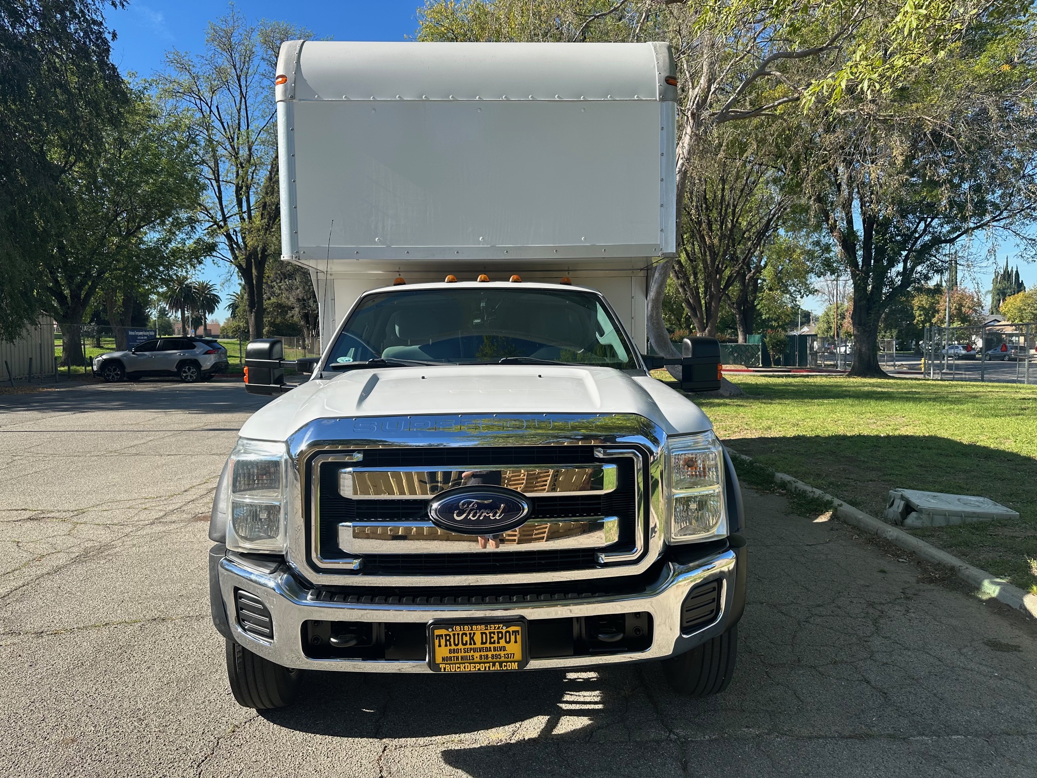 2014 Ford F-550 S.D. Box Truck with Liftgate, 6.8L V-10, auto trans, A/C, tilt, cruise, power windows and locks, power mirrors, steering wheel controls, backup camera, trailer brakes, 19,500 g.v.w., Marathon body, 16' body, 19' with the dog house over the cab, side door entry, lighted interior, tool bins, MBB liftgate, 1800 lbs. capacity, 80%-90% tire tread, Ex-Local Studio Truck, fleet serviced and maintained since new. Nationwide shipping and financing are available. Checkout all our inventory at TruckDepotLA.com.