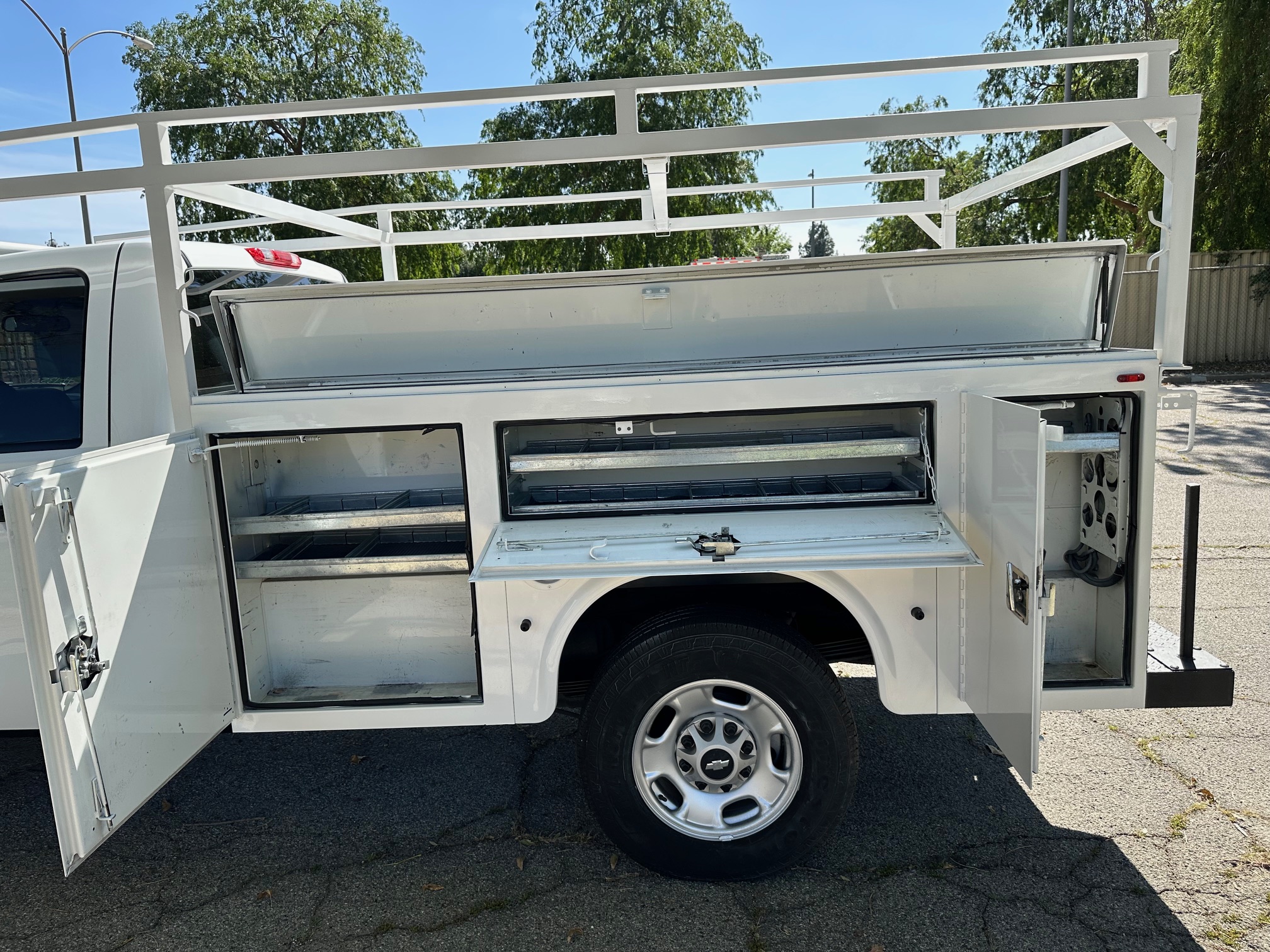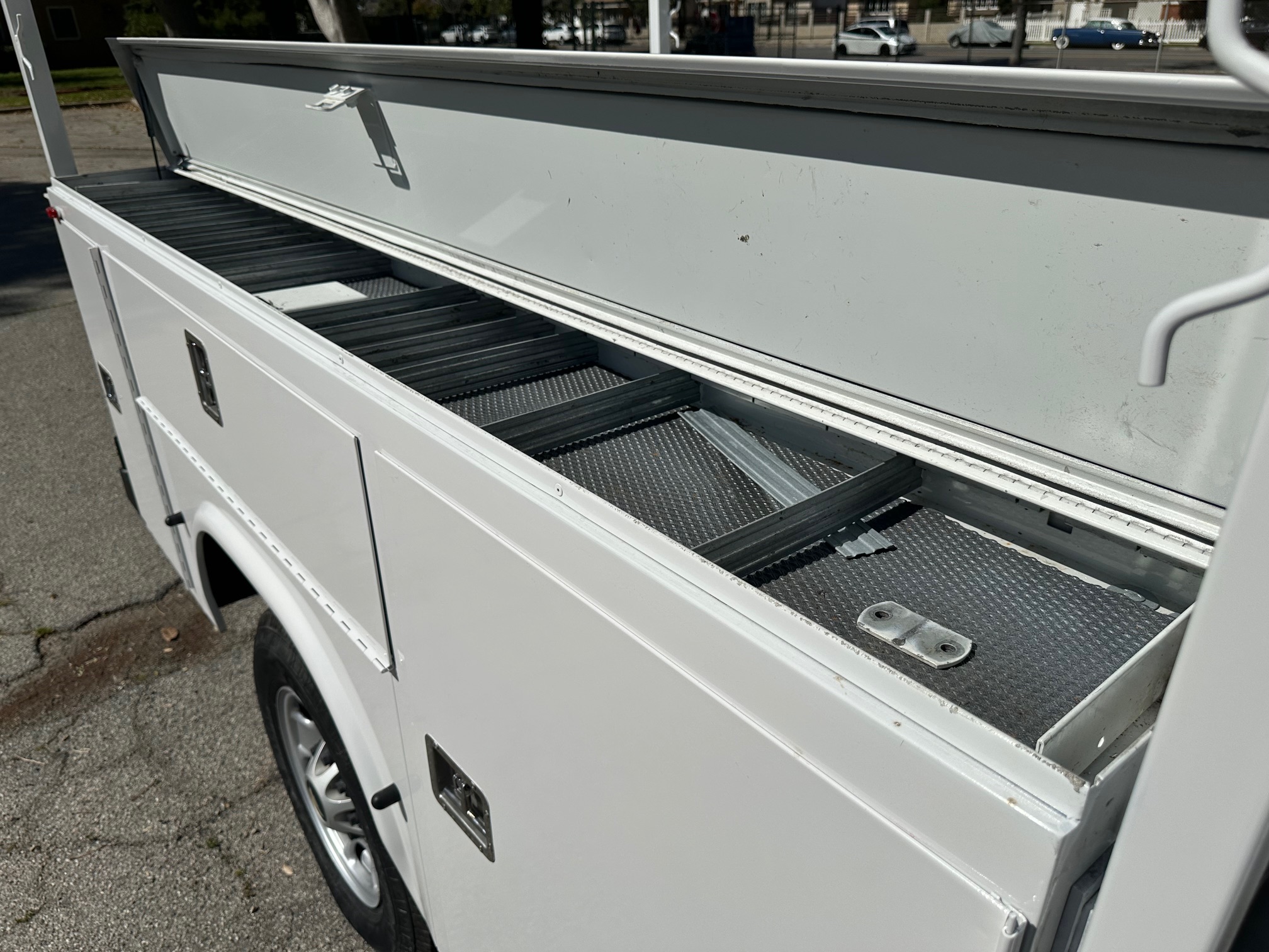 Showing 116,000 miles, this truck has been exceptionally maintained and remains in excellent mechanical and cosmetic condition. It features a high-quality Knapheide service body with multiple secure storage compartments, top-loader trays for organized tool access, and a sturdy ladder rack for transporting longer materials. The enclosed utility body (which can be removed if desired) adds versatility depending on your business needs.