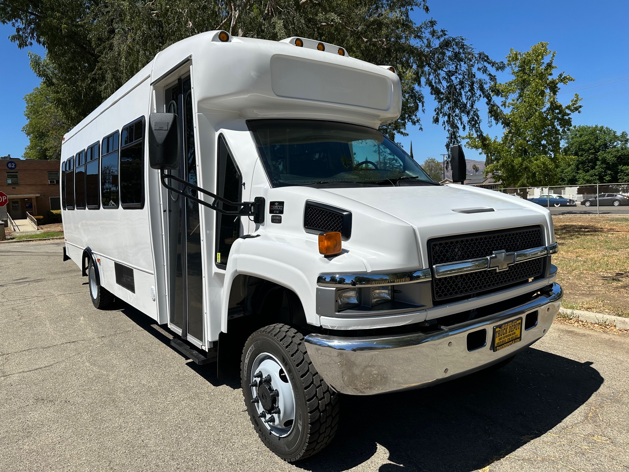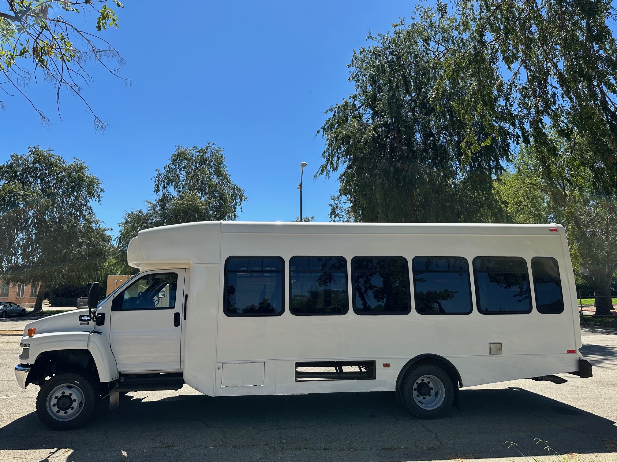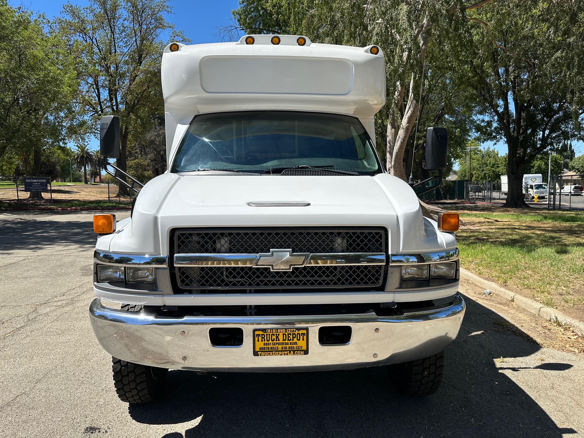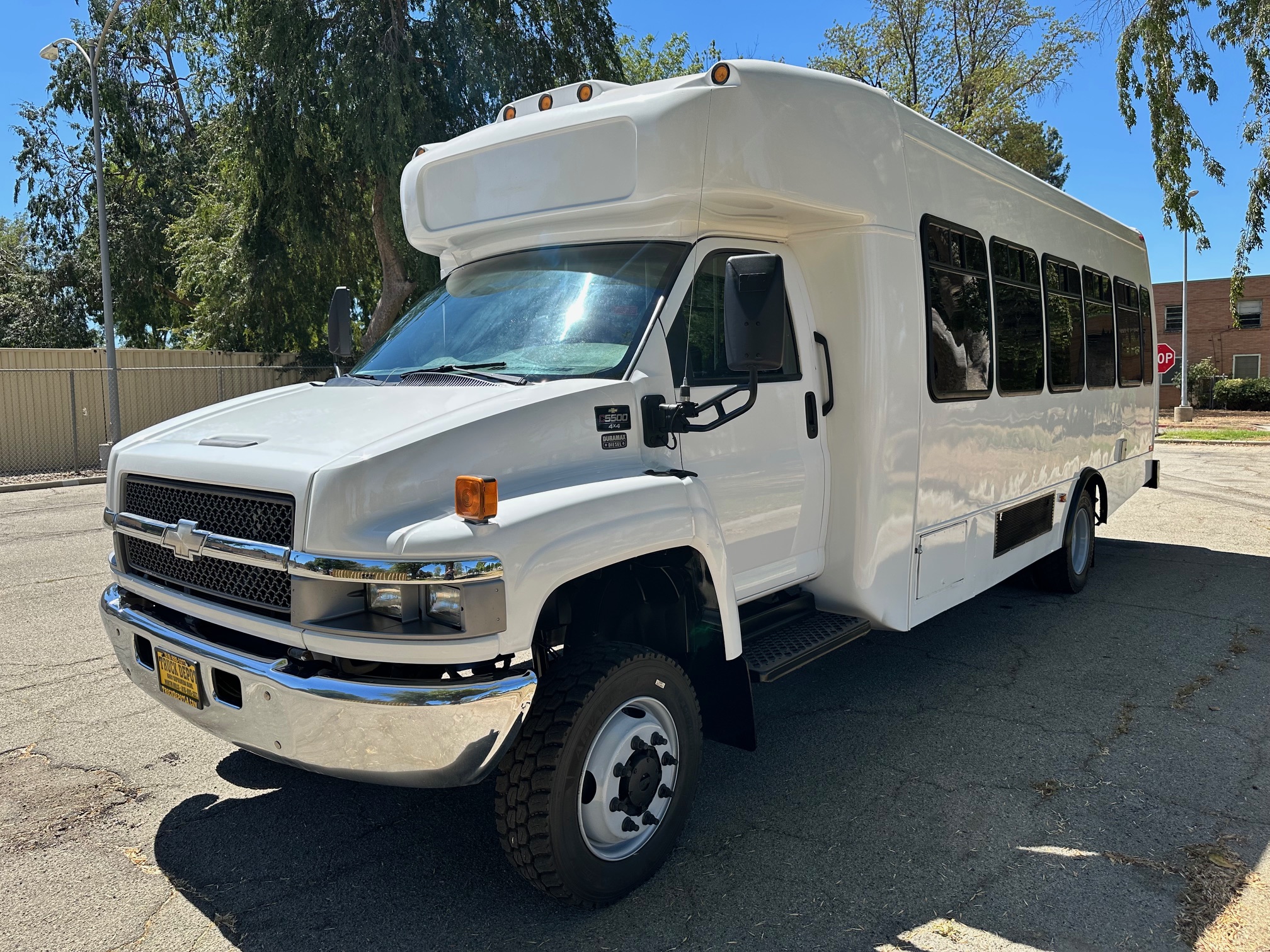 2008 Chevy Kodiak C-5500 4X4 Diesel Bus, 6.6L Duramax diesel, Allison auto trans, front & rear A/C & heat, 158k miles, tilt, cruise, power mirrors, exhaust brake, PA system, 19,500 g.v.w., Supreme Bodies conversion, seats 29 passengers, overhead storage, new tires, just serviced, runs and drives great. Nationwide shipping and financing are available. Checkout all our inventory at TruckDepotLA.com.
